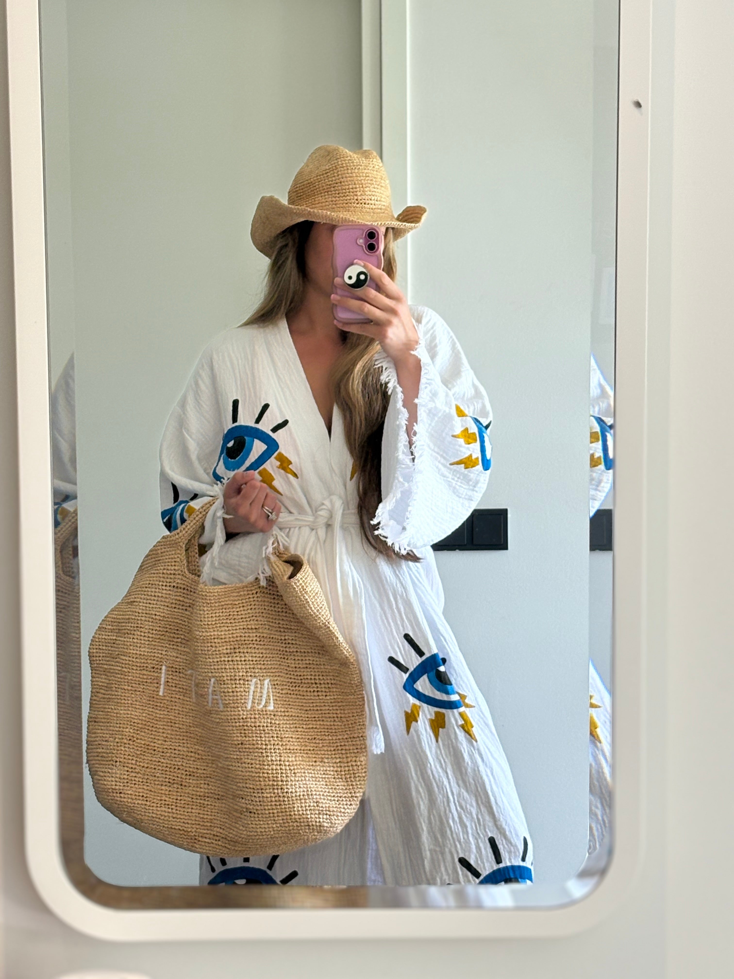 Our handmade XL MATI Raffia Bag is thoughtfully designed to carry everything you might need at the beach, by the pool or in the city! This bags' texture and bright embroidery instantly elevates any outfit and can effortlessly transition to your needs throughout the day. A truly beautiful, high quality piece that packs away easily.